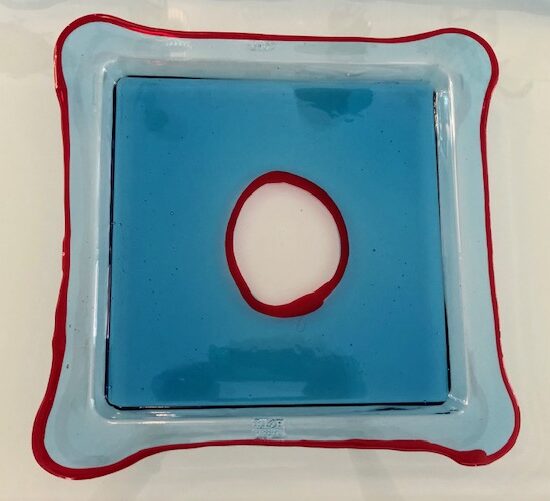 Questo vassoio è in resina di colore Azzurro chiaro trasparente, con il profilo in colore Rosso pieno.