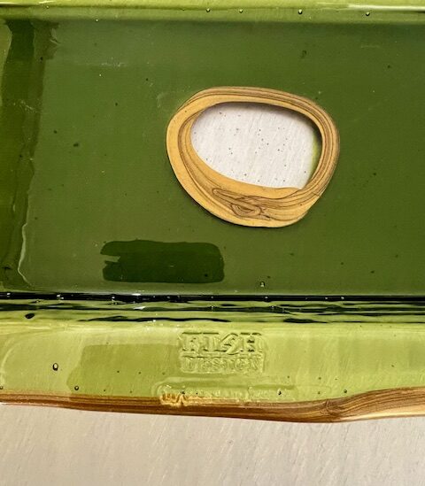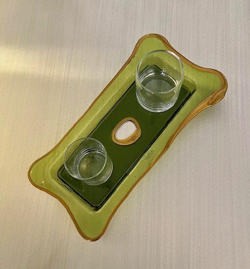 In questo caso il Vassoio-S-Rettangolare di Gaetano Pesce è di colore Verde bottiglia trasparente con il bordo Oro.